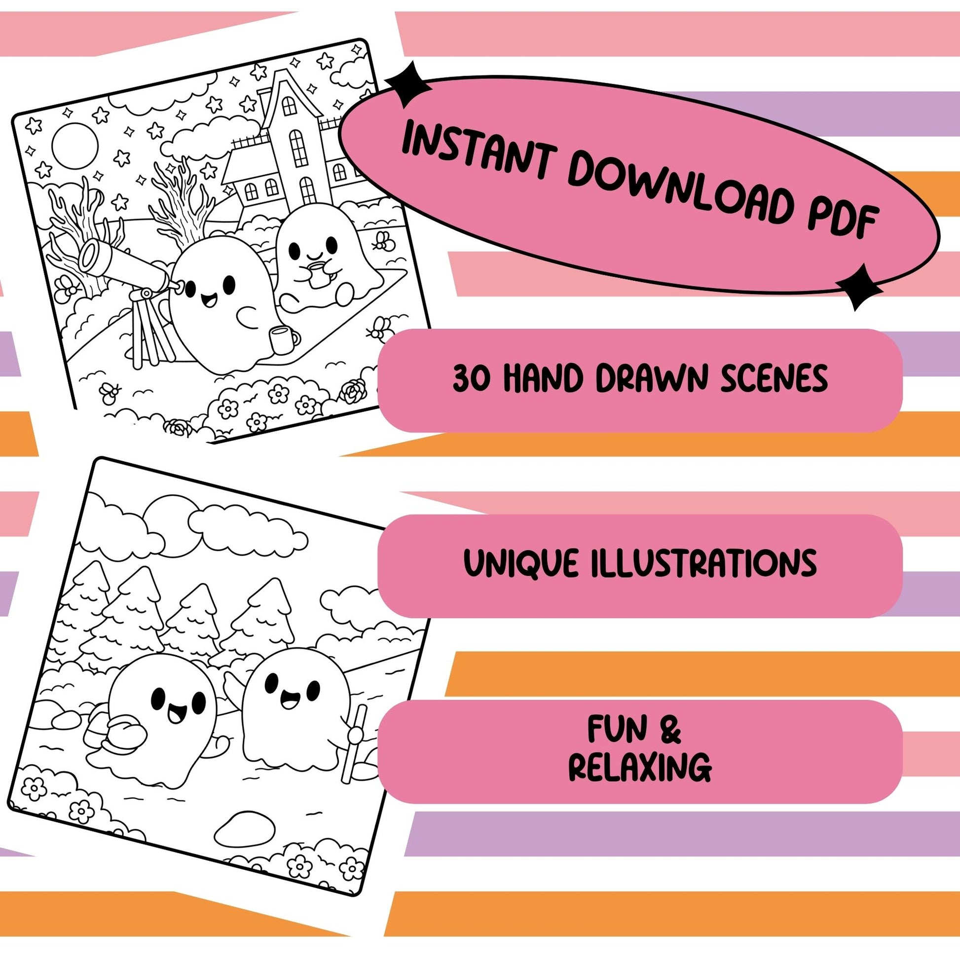 Meet your new paranormal pals in Spooky Days, a charming coloring book featuring two adorable ghost besties living their boo-tiful lives. These little ghouls are dead serious about having fun — whether they’re baking spooky treats, hiking through haunted hills, singing their ghost hearts out at karaoke, or curling up with a creepy-cute book.